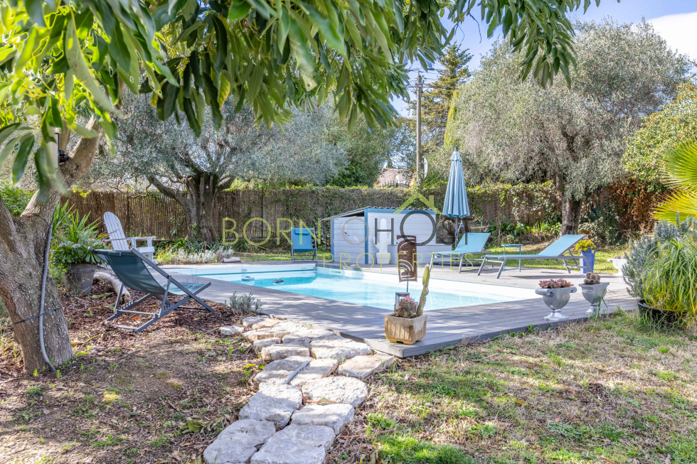 La piscine est chauffée par une pompe à chaleur. Le jardin est arboré de belles essences, oliviers, avocatier.